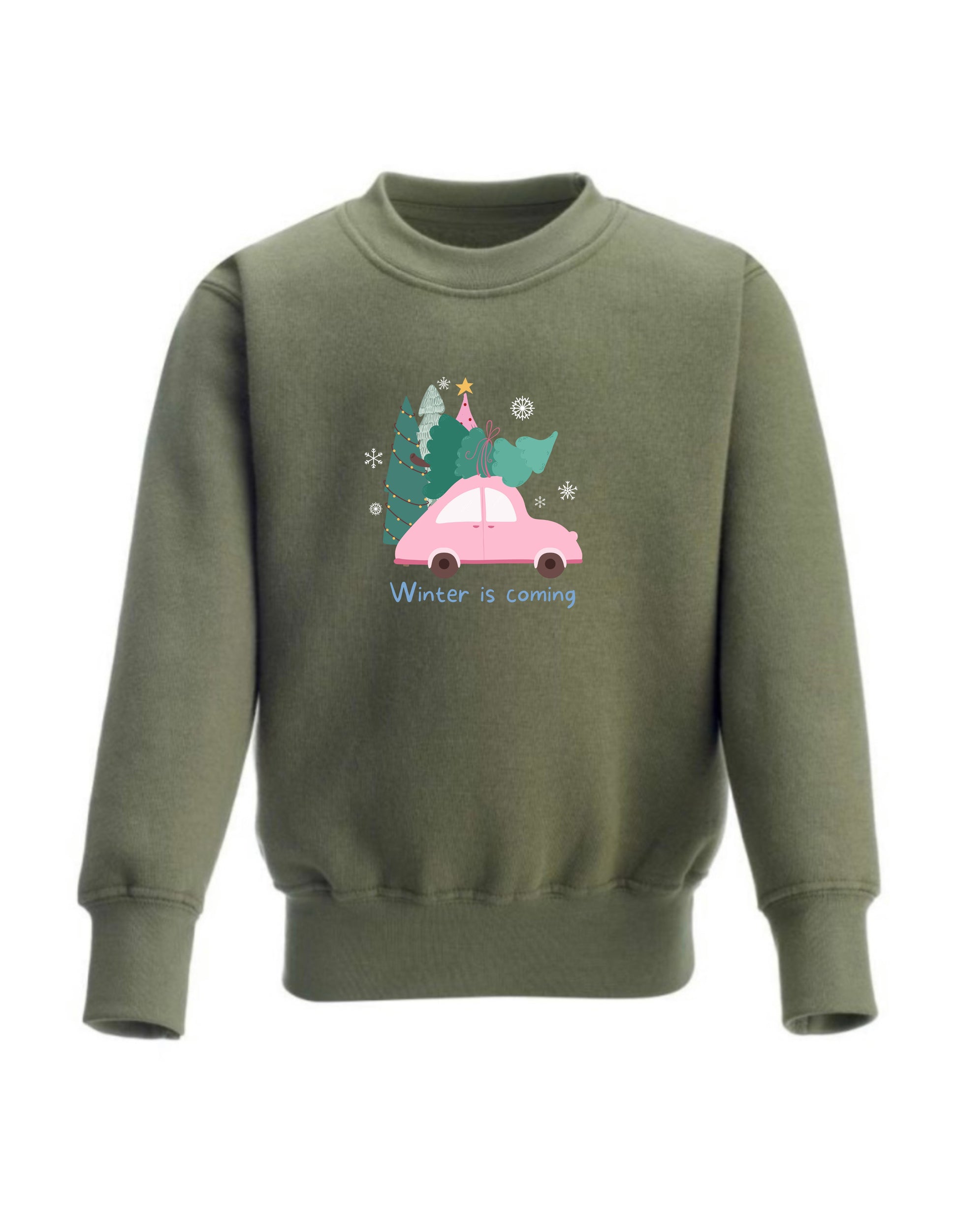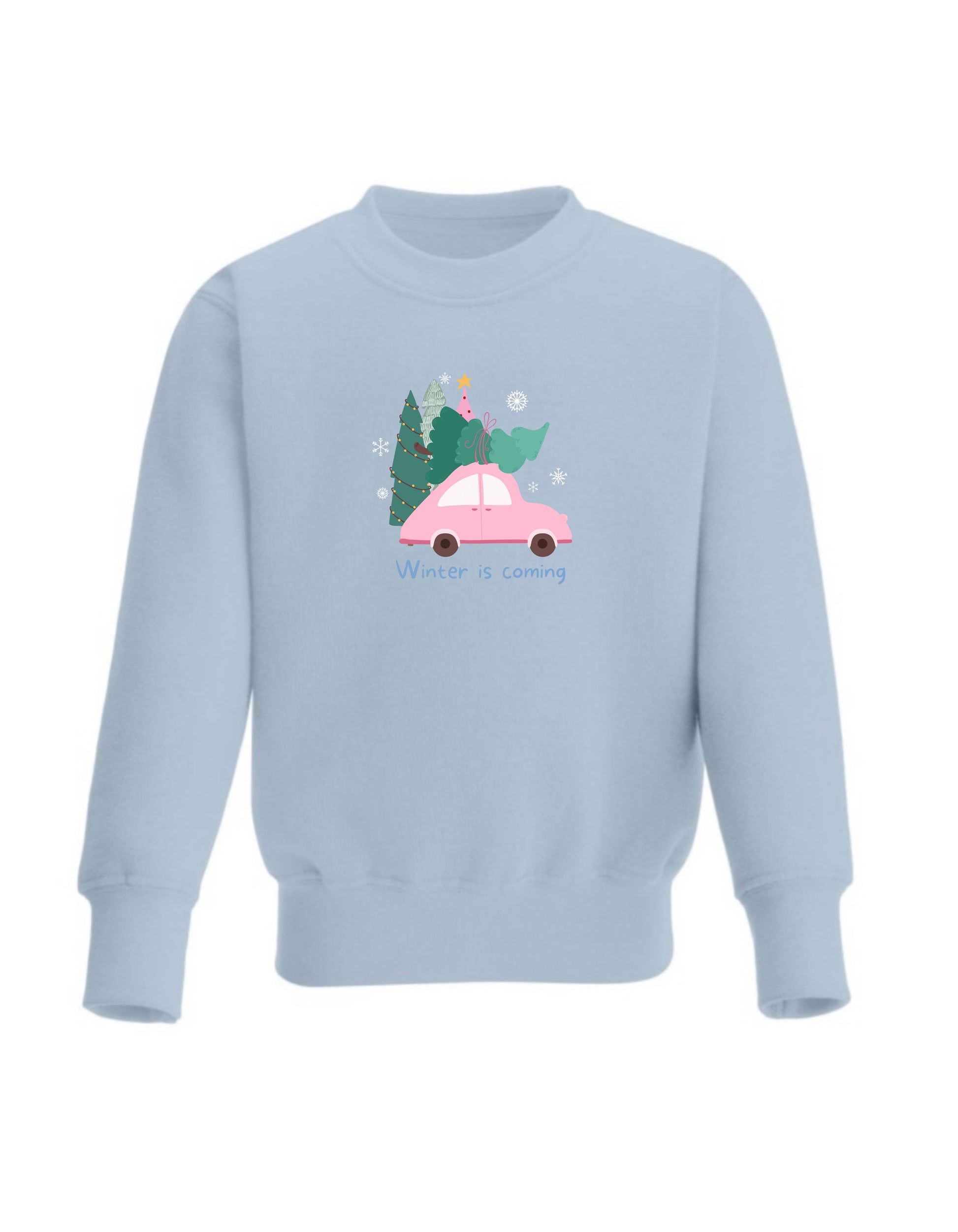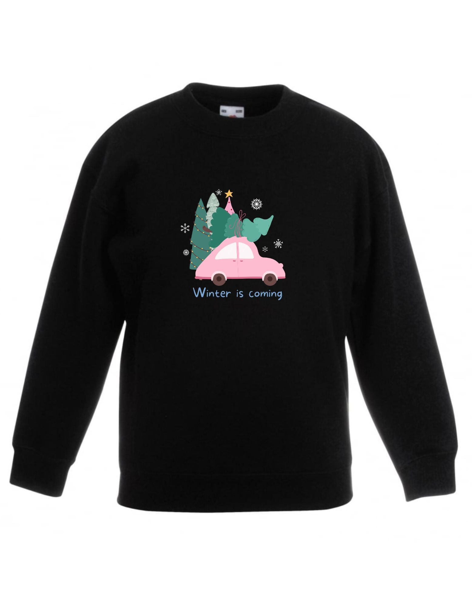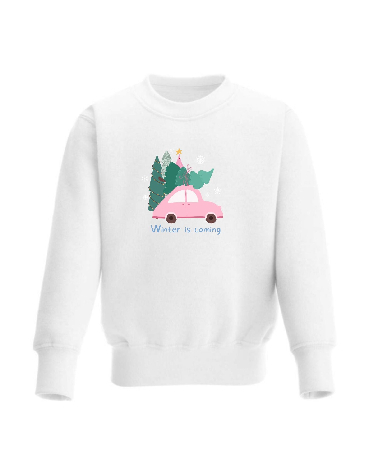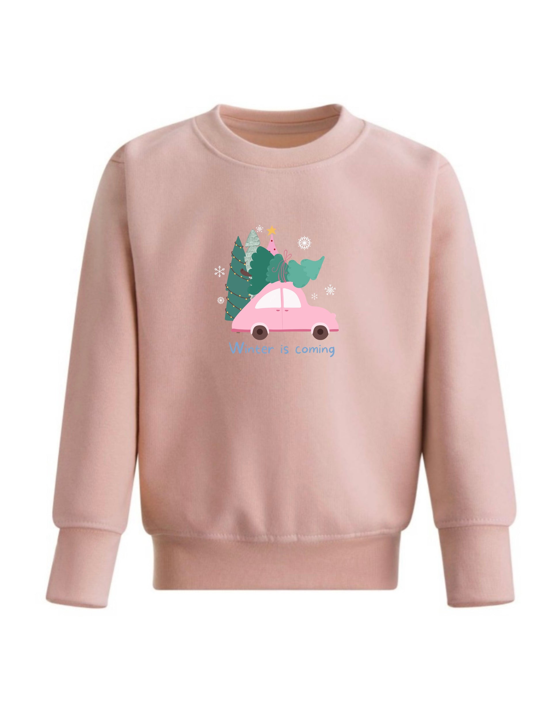 Kid’s Crew Neck Fleece Sweatshirt with cute Pink car Christmas design, winter is coming